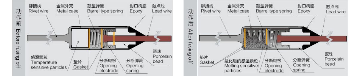 Lorsque la température ambiante dépasse la température de fonctionnement, les particules sensibles fondent sous l'effet de la chaleur du fil conducteur. Dans ces conditions, le ressort d'ouverture sera écarté et la force élastique poussera l'électrode vers le ressort pour couper la connexion avec le fil conducteur. Le courant sera également coupé.